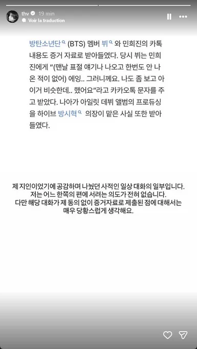 تم قبول رسائل تطبيق كاكاو توك بين عضو فرقة BTS، ڤي، ومين هي جين كدليل. في ذلك الوقت، أرسل تاي واستقبل رسائل كاكاو توك مع مين هي جين التي قالت: “يتحدثون دائمًا عن قضايا الانت.حال، لكن لم يصلني أي شيء من هذا القبيل ولو لمرة واحدة”. “أوه، فهمت… لقد اطلعت عليها أيضًا، وبدا الأمر مشابهًا. هذا ما قلته”. بالإضافة إلى ذلك، تم الإقرار بأن رئيس مجلس إدارة HYBE، بانغ سي هيوك، شارك في إنتاج ألبوم ILLIT الأول. “لقد كان جزءًا من محادثة خاصة يومية بيننا لأننا مجرد معارف. لم تكن لدي أي نية للانحياز لأي طرف. لقد صُدمت حقًا من تقديم هذه المحادثة كدليل دون أي نقاش أو موافقة مسبقة.